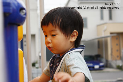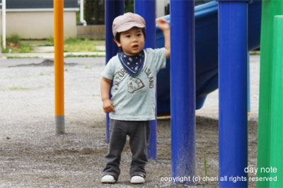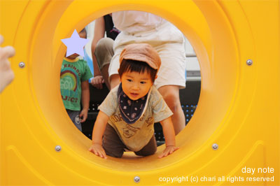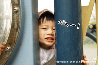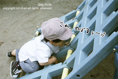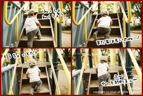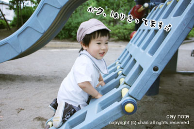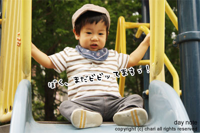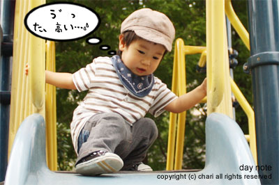 屋外のすべり台をひとりでなかなかすべれないちぃ…。