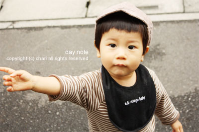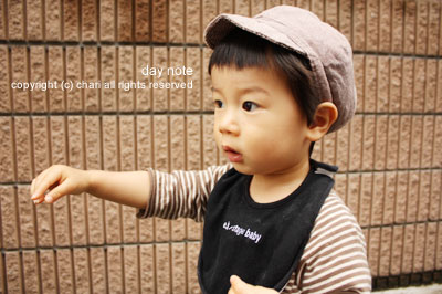 お散歩中、興味があるものを指差します。