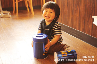 コーヒーの缶を渡されてご機嫌。